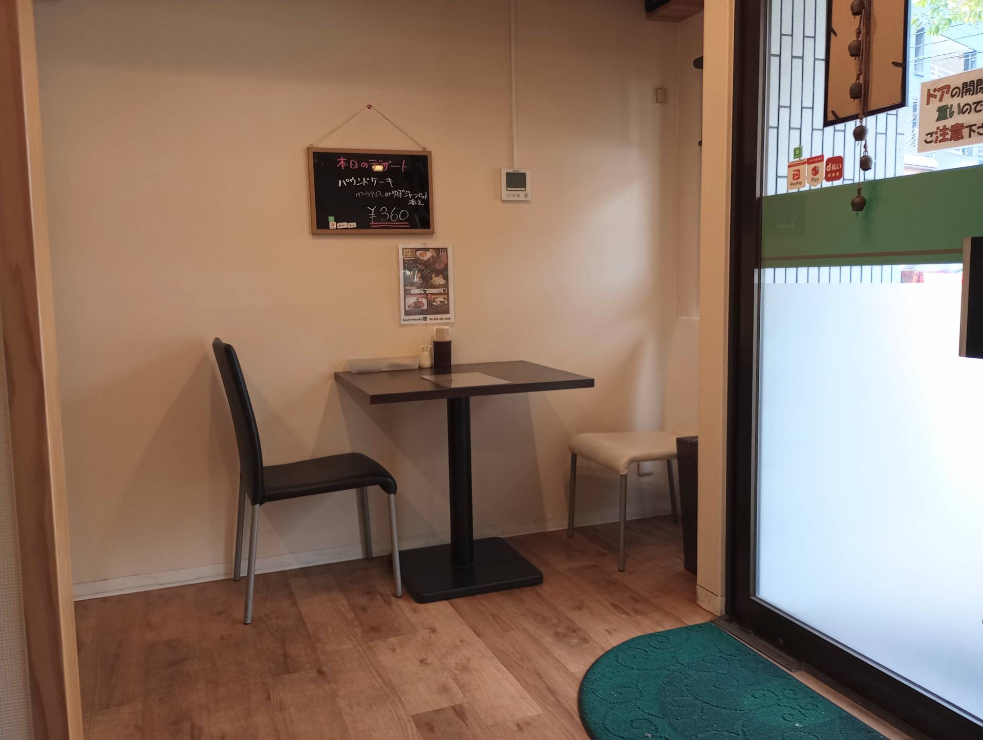 子育て支援:多目的トイレ×、お子様椅子×、お子様食器〇、お子様メニュー×